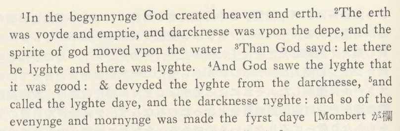 - これが、創世記の初めの部分で,節区分は,Monbertによるもので,ここでは文中にかかれている。五書に続いて、1531、「ヨナ書」、さらに、ヨシュア記、歴代史下までを、完成したが,この出版は、ティンダルによらず,マシュー聖書に編入されることになる。1534年には、創世記の改訂版、お呼び新約の改訂版(決定版)が出されることになる。